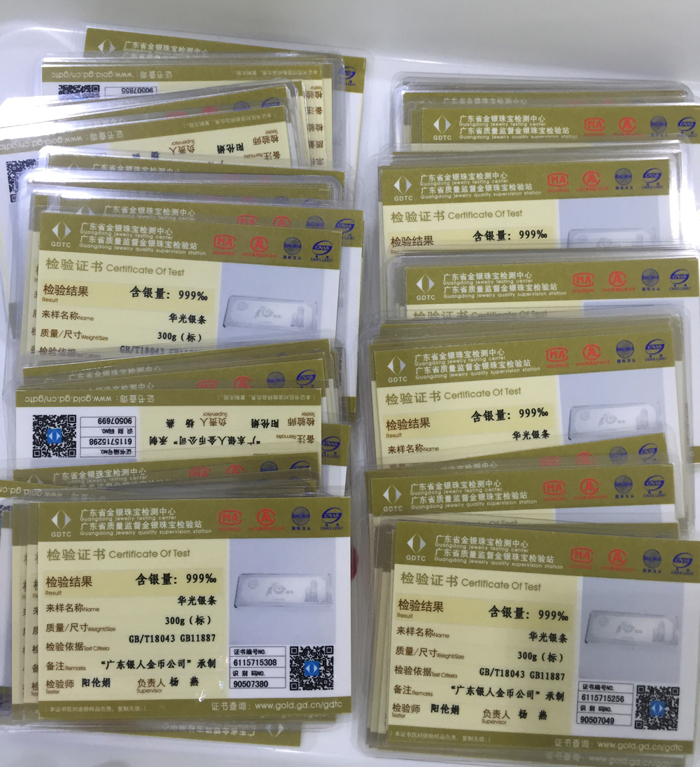 廣東省質(zhì)監(jiān)局白銀質(zhì)量含銀量投資銀條銀磚檢測(cè)鑒定證書(shū)