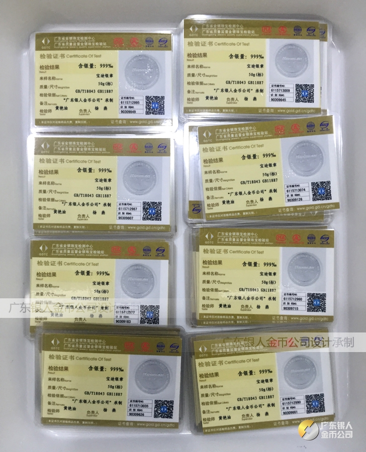 廣東銀人金幣公司承接客戶(hù)個(gè)性化定制的金銀幣、金銀章、金銀條、金銀牌、金銀盤(pán)均由國(guó)家質(zhì)監(jiān)部門(mén)、嚴(yán)格檢測(cè)、權(quán)威鑒定: