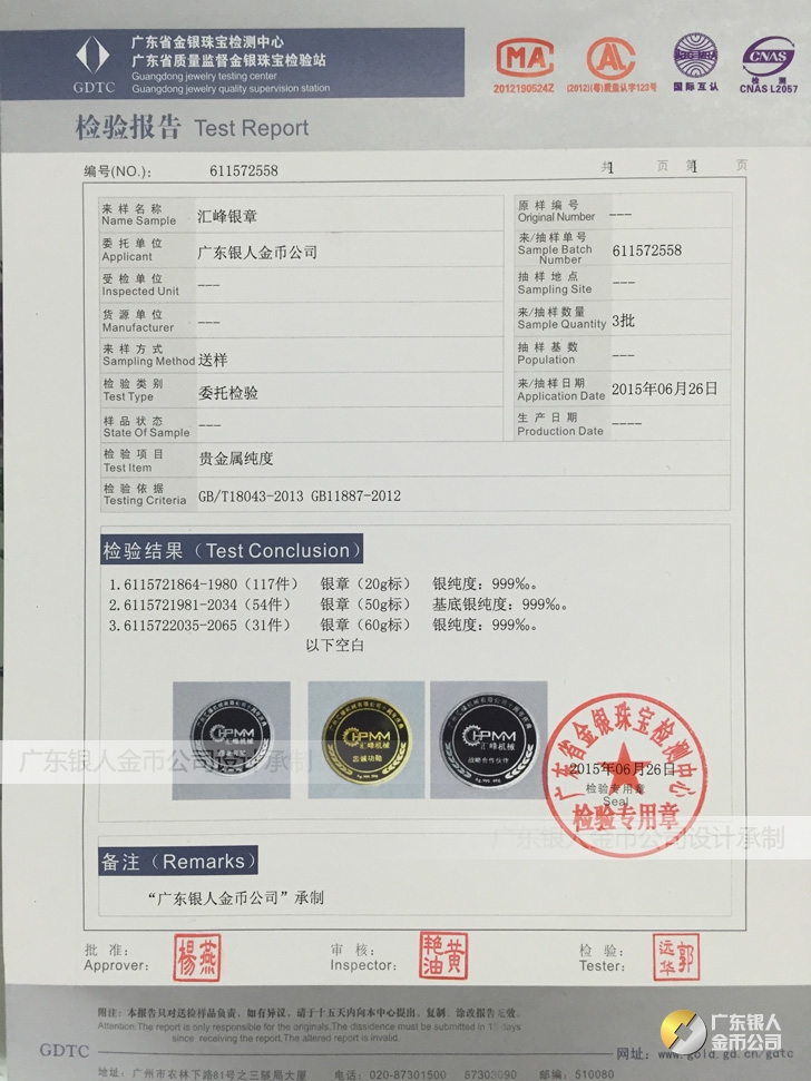 廣東銀人金幣公司承接客戶個性化定制的金銀幣、金銀章、金銀條、金銀牌、金銀盤均由國家質(zhì)監(jiān)部門、嚴格檢測、權(quán)威鑒定: 出具————國家質(zhì)檢、檢測報告。