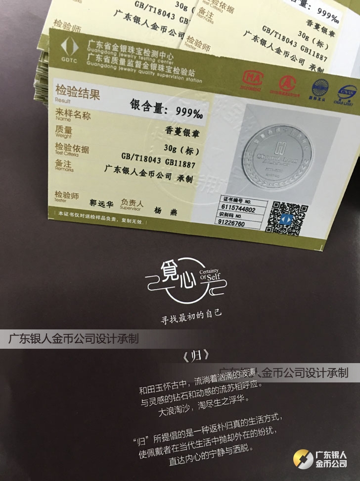 廣東銀人金幣公司承接客戶個(gè)性化定制的金銀幣、金銀章、金銀條、金銀牌、金銀盤均由國家質(zhì)監(jiān)部門、嚴(yán)格檢測(cè)、權(quán)威鑒定: