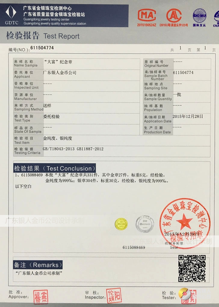 廣東銀人金幣公司承接客戶個性化定制的金銀幣、金銀章、金銀條、金銀牌、金銀盤均由國家質監部門、嚴格檢測、權威鑒定: