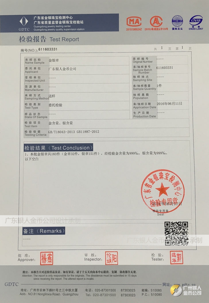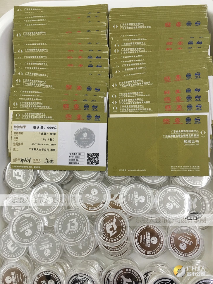 廣東銀人金幣公司承接客戶個性化定制的金銀幣、金銀章、金銀條、金銀牌、金銀盤均由國家質監部門、嚴格檢測、權威鑒定: