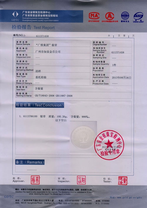 • 2014-6月:廣東萬銀貴金屬經(jīng)營公司定制純銀紀念章與紀念銀條加工制作。
