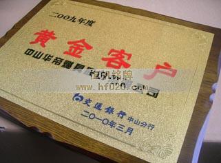 交通銀行——為交通銀行中山分行批量“交通銀行中山分行2009年度”黃金客戶獎牌、五星級黃金客戶獎牌牌匾及銀行獎牌、銀行獎狀。