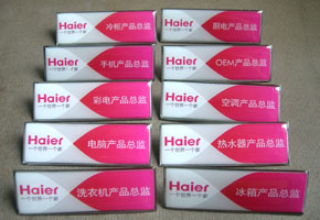 海爾集團——為集團公司制作員工佩戴的員工胸卡、有機玻璃胸卡、以及工作人員使用的水晶工作牌、銷售賣場營業員胸牌、導購員水晶胸牌。
