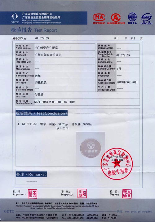 廣東省質監純金銀紀念章鑒定報告