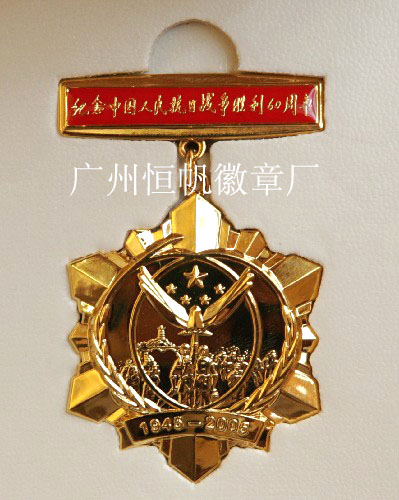 胡錦濤總書記題寫了“紀(jì)念中國人民抗日戰(zhàn)爭勝利60周年”的章名。紀(jì)念章為六組利劍組成一個(gè)六角形徽章基座,正面鑄有象征中國共產(chǎn)黨領(lǐng)導(dǎo)的革命人民大團(tuán)結(jié)的5顆五角星、象征人類和平的鴿子和橄欖枝、象征革命圣地的延安寶塔山,以及軍民合力抗戰(zhàn)的戰(zhàn)斗場面。六組利劍表示武裝斗爭,向內(nèi)的合力象征抗日民族統(tǒng)一戰(zhàn)線;5顆五角星和延安寶塔山表示中國共產(chǎn)黨在全民族團(tuán)結(jié)抗戰(zhàn)中的中流砥柱作用;和平鴿展開的雙翅構(gòu)成“VICTORY(勝利)”的第一個(gè)字母“V”,象征抗戰(zhàn)勝利;沖鋒陷陣的作戰(zhàn)場面表現(xiàn)了中華民族抗戰(zhàn)的英勇精神;手持大刀的八路軍戰(zhàn)士和手拿地雷的老百姓顯示了軍民團(tuán)結(jié)抗戰(zhàn)的強(qiáng)大力量。本章直徑50mm,厚3.0mm,主章為鋁合金,鍍24k金。