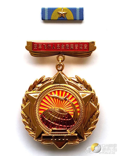 空軍功勛飛行人員金質榮譽獎章,主要授予獲得一等功以上獎勵的飛行人員;空軍飛行人員金(銀)質榮譽獎章,主要授予因連續安全飛行榮立二等功后再次榮立二(三)等功的飛行人員;空軍飛行人員銅質榮譽獎章,主要授予因連續安全飛行首次榮立二等功的飛行人員。圖為飛行金質獎章實物。