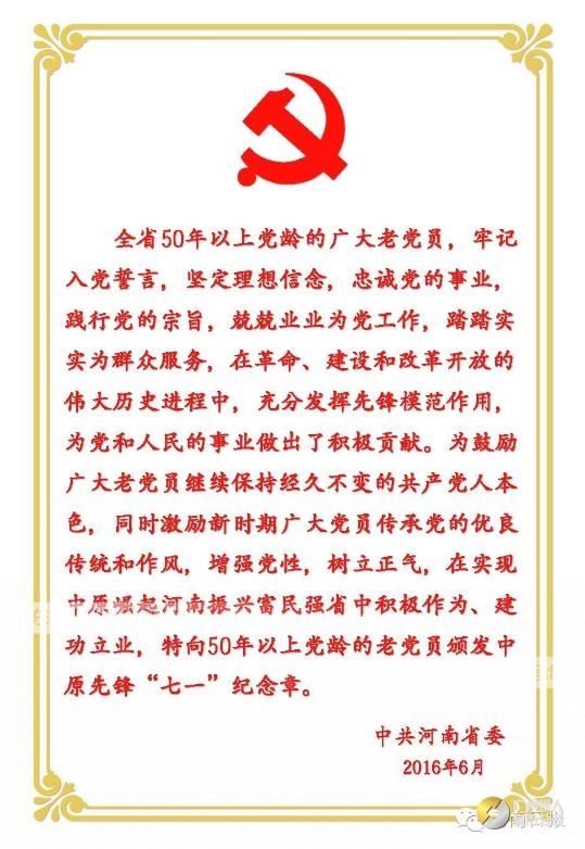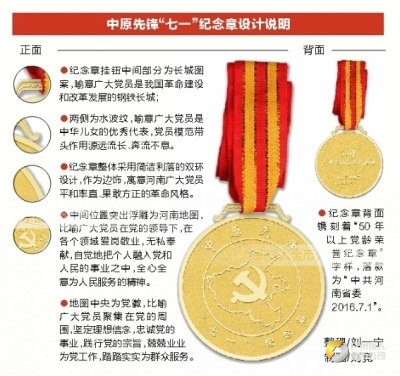 為50年以上黨齡老黨員頒發“七一”紀念章,在我省尚屬首次。省委組織部負責同志介紹說,中原先鋒“七一”紀念章的設計方案,是經省委主要領導親自審定的。這個紀念章,蘊含著省委對50年以上黨齡老黨員幾十年來忠誠黨的事業、踐行黨的宗旨、兢兢業業為黨工作、踏踏實實為群眾服務的敬重和肯定,同時也傳遞著省委對老黨員的關心、愛護與牽掛。省委希望通過向老黨員頒發“七一”紀念章,鼓勵廣大老黨員繼續保持經久不變的共產黨人本色,同時激勵新時期廣大黨員傳承黨的優良傳統和作風,增強黨性,樹立正氣,在實現中原崛起河南振興富民強省進程中積極作為、建功立業。據悉,黨組織關系在河南且有50年以上黨齡,能夠自覺遵守黨章黨規,認真參加組織生活,按期繳納黨費的老黨員都在頒發“七一”紀念章的范圍內,全省共有26.7萬名老黨員符合頒發條件。“七一”前后,各級黨組織將通過舉行頒發儀式、走訪慰問、召開座談會等多種形式,為各地的老黨員頒發紀念章。今后,在黨的生日逢5周年、逢10周年,省委都將向符合條件的老黨員頒發紀念章。