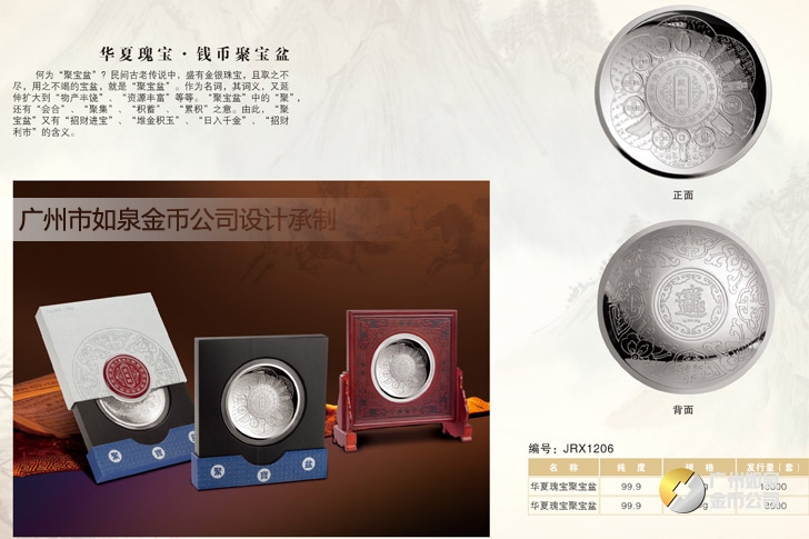 廣州市如泉金幣公司依托上海造幣廠和深圳國寶造幣廠等造幣公司以及金銀制品廠,設計定做紀念幣、紀念章、金銀幣、金銀章、金銀條,采用造幣工藝、選用千足金銀,個性定制金幣、定做銀幣、訂做金條、訂制銀條、制作紀念銀幣、制造紀念金幣、加工紀念銀章、生產紀念金章,純金純銀鑄造、全部國檢、權威檢測。